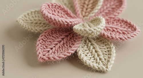 © bro, Fototapeta premium Knitted flower with soft pink and cream petals on neutral background