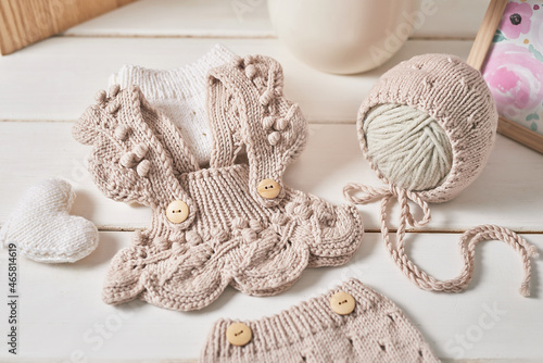 © Aleksandr, Fototapeta premium Knitted kids clothes and accessories for knitting. Needlework and knitting. Hobbies and creativity. Knit for children. Handmade