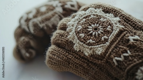 © Lesuna, Obraz premium Knitted mittens with intricate patterns