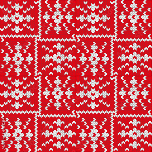 Fototapeta premium Knitted ornament Christmas ugly sweater seamless pattern design for unisex wear, printable cards, party posters, banners, sublimation. Vector illustration EPS10. Red and white colors.