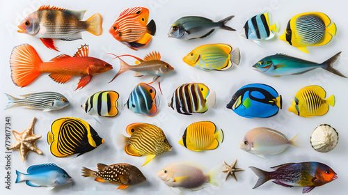© Stefan, Naklejka premium Knolling of Fishes and Sealife with white background.