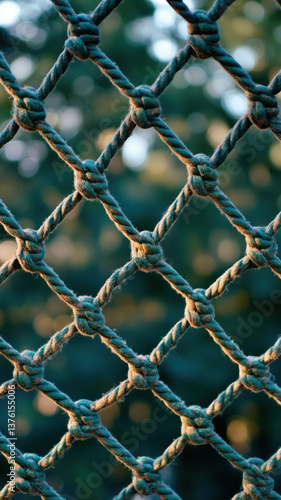 Fototapeta premium Knotted rope netting creates a geometric pattern against a blurred green...