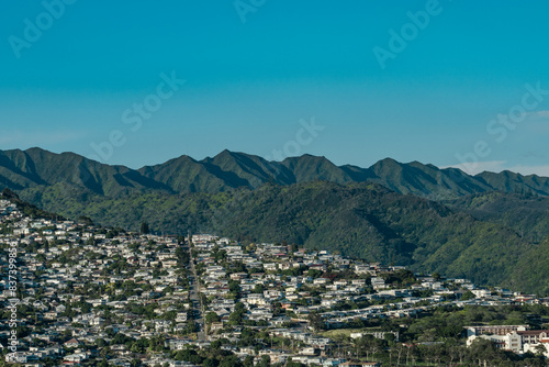 © youli zhao, Obraz premium Koʻolau Range is a name given to the dormant fragmented remnant of the eastern or windward shield volcano of the Hawaiian island of Oʻahu. Saint Louis Heights / Waʻahila Ridge