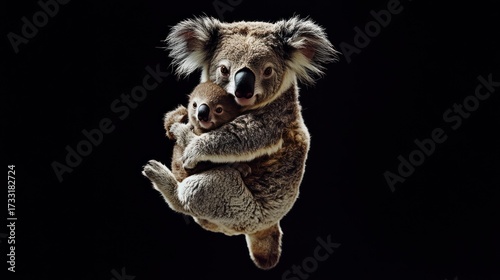 Obraz premium Koala bear embracing cub against black background wildlife portrait