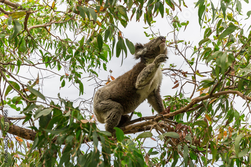 Fototapeta premium Koala bear reaching for eucalyptus tree branch for sustenance.