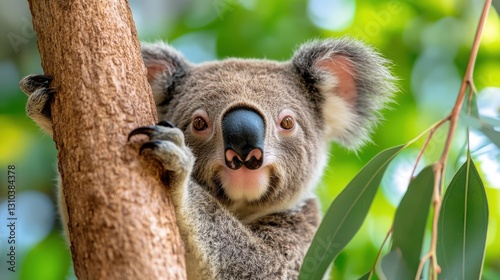© VirtuLens, Obraz premium Koala climbing eucalyptus tree in vibrant Australian landscape