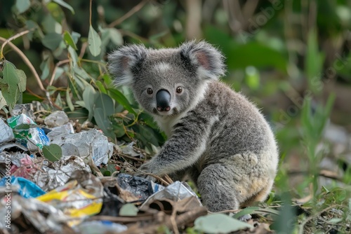 Fototapeta premium Koala Cub Amidst Plastic Waste in a Forest Setting