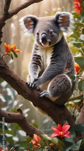 © monu, Fototapeta premium koala cub running , portrait of koala in the flower , wild jungle