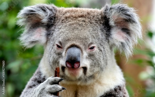 Obraz premium Koala eating eucalyptus. Adorable koala enjoys a eucalyptus leaf, symbolizing Australian wildlife and nature's beauty.
