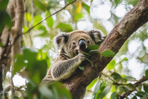 Fototapeta premium Koala enjoys eucalyptus leaves while perched on a tree branch in the forest,...