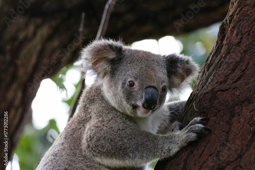 Obraz premium Koala gripping a eucalyptus tree in its natural habitat, showing texture of...