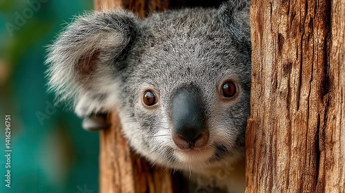 © Natalia, Obraz premium koala hanging onto a tree with a curious expression,stock photo