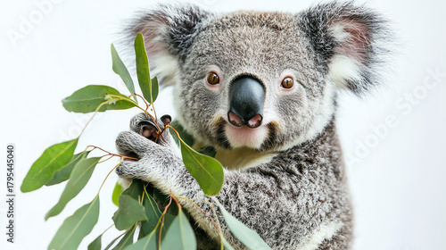 © BURINKUL, Obraz premium Koala hugging small leaf branch, white background