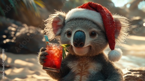 © Tatyana, Fototapeta premium Koala in Santa Hat on Sunny Beach with Tropical Drink Ocean Background Christmas Holiday Cheer