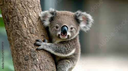 Fototapeta premium Koala joey clinging to tree trunk, blurred background