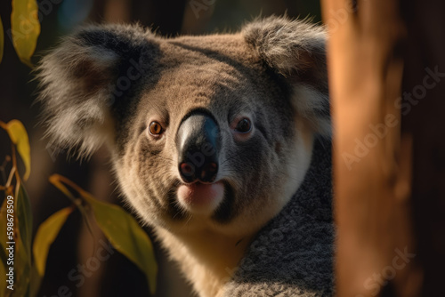 Obraz premium Koala looking at the camera, beautiful background, eucalyptus forest background, ai generated.