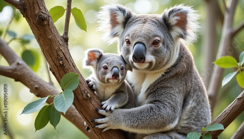 © Neuroillustrator3033, Fototapeta premium Koala mother and baby cuddling on a tree branch