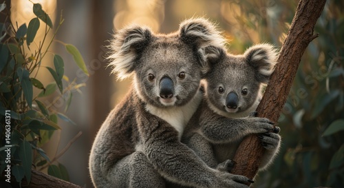 © Farid Nisuki, Fototapeta premium Koala Mother and Cub Hugging Tree Branch in Forest Setting