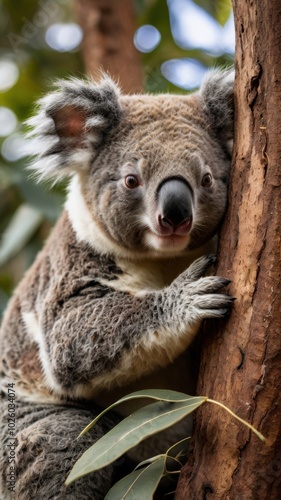 © SUNSU, Obraz premium Koala on Eucalyptus Tree: A charming portrait of a koala clinging to a eucalyptus tree, showcasing its soft fur and endearing expression.