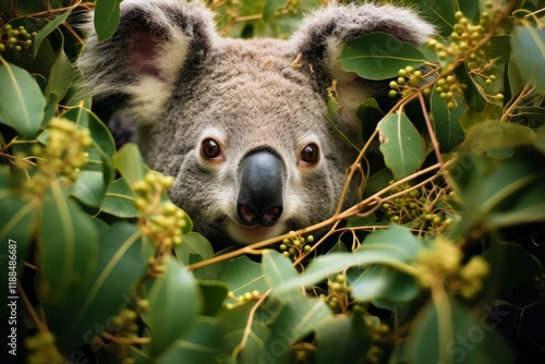 Obraz premium Koala peeking through eucalyptus leaves, showing its curiosity in natural...