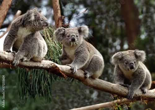 © slowmotiongli, Obraz premium Koala, phascolarctos cinereus, Group sitting on Branch, Australia