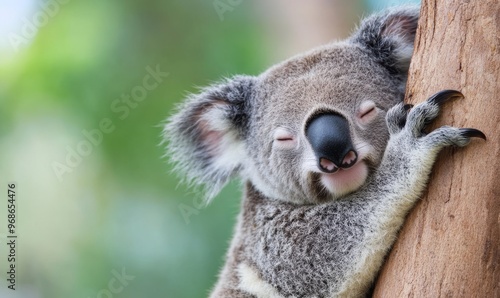 © PLATİNUM, Naklejka premium Koala Resting Peacefully on a Tree Trunk During a Sunny Day in Australia’s Lush Forests