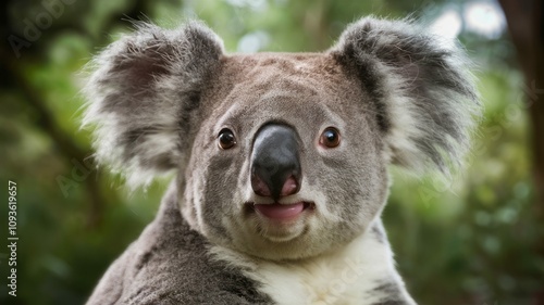 © , Naklejka premium Koala's Curious Gaze: a close-up captures the adorable face of a koala, known for their calm demeanor, with their distinctive features and endearing expression.