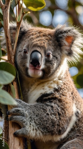 Obraz premium Koala's Curious Gaze: A close-up portrait of a koala clinging to a tree...
