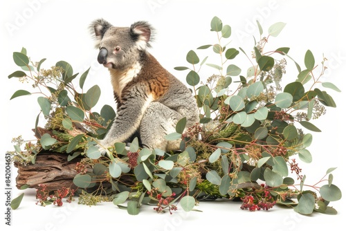 © zebronit, Fototapeta premium Koala sitting on a eucalyptus branch on a white background