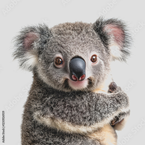 Fototapeta premium Koala sitting on a white surface in a simple indoor environment with natural...