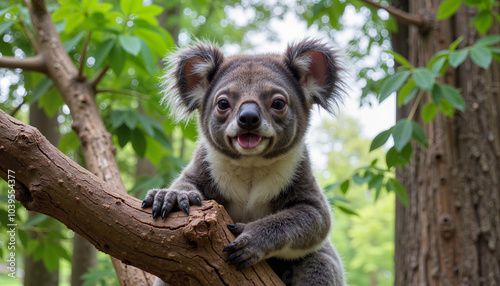 © Krasavina Alena, Fototapeta premium Koala Sitting on Tree Branch in Green Forest