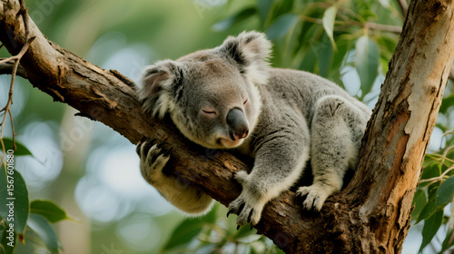 © Abdullah, Fototapeta premium Koala taking a peaceful nap in a eucalyptus tree surrounded by leaves
