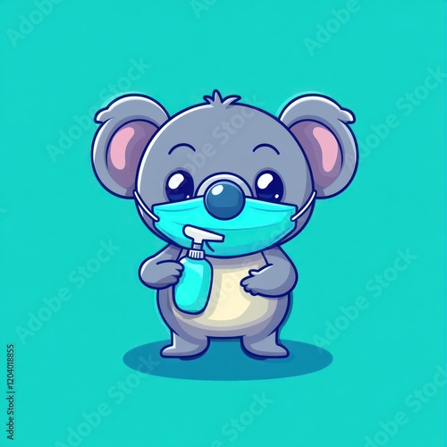 Fototapeta premium Koala wearing mask, holding sanitizer, teal background, hygiene illustration
