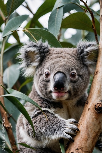 Fototapeta premium Koala with a cheerful expression, climbing a tree surrounded by eucalyptus leaves