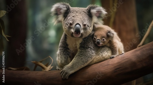 © Kateryna Kordubailo, Obraz premium Koala with joey on its back on a branch. Generative AI