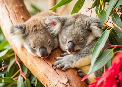 © Normal Desing, Obraz premium Koalas Sleeping in Eucalyptus Trees A pair of koalas nestled comfortably in the branches of a eucalyptus tree, their soft gray fur blending with the bark.