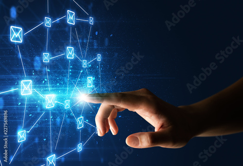 Fototapeta premium Kobiecy palec dotykający wiązki światła otoczonego niebieską grafiką z kopertami