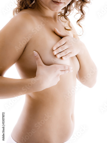 © Jacek Chabraszewski, Fototapeta premium Kobieta bada jej piersi na białym tle