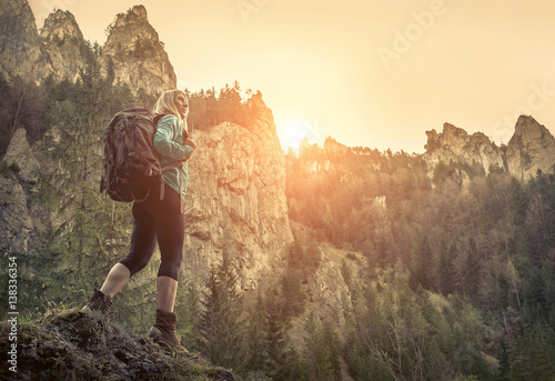 Obraz premium Kobieta na wycieczkę po górach w spreeng czasie.
