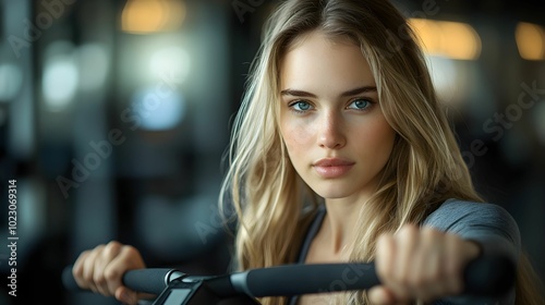 Naklejka premium kobieta, trening, siłownia, blondynka, sportowy strój, ćwiczenie, stock photo, Canon EOS R3, przysłona f/2.0, nowoczesna siłownia, aktywność fizyczna, fitness, kobieta w ruchu, trening siłowy, zdrowy,