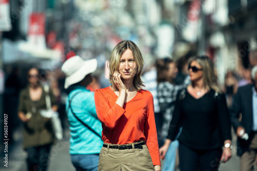 © De Visu, Fototapeta premium Kobieta w czerwonej bluzce pozuje na deptaku.