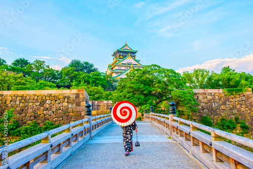 Fototapeta premium Kobieta w kimonie trzymająca zamek w Osace i japoński parasol