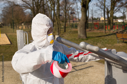 © Adam, Naklejka premium Kobieta w maseczce i kombinezonie ochronnym zabezpiecza sprzęt sportowy w parku by z niego nie korzystać