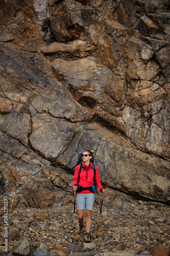 © fesenko, Naklejka premium Kobieta w sportowej spacery z plecakiem turystycznym i kije