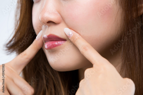 © kei907, Naklejka premium Kobieta, wskazując na linię zagięcia