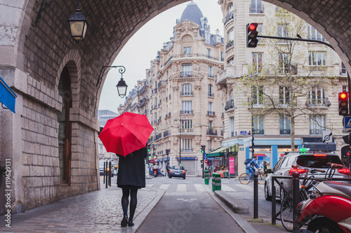 © Song_about_summer, Fototapeta premium kobieta z czerwonym parasolem spacerując po ulicy Paryża, Francja