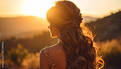 Obraz premium Kobieta z długimi włosami na polu o zachodzie słońca