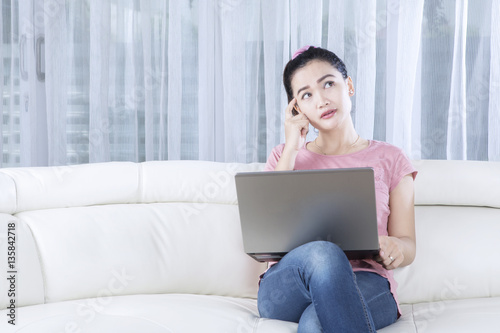 © Creativa Images, Fototapeta premium Kobieta z laptopa marzeń na leżance