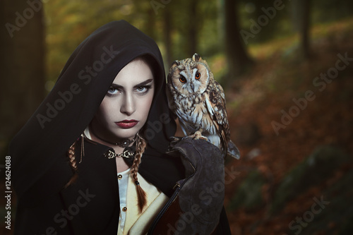 © captblack76, Fototapeta premium Kobieta z sową na ramieniu