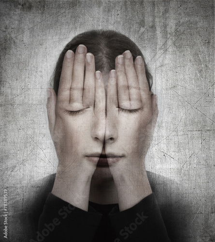 © cranach, Naklejka premium Kobieta zakrywa twarz rękami na tle grunge. S